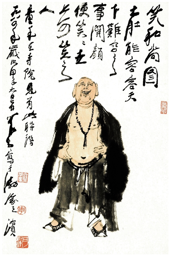《笑和尚图》此画题跋道出童年寺院记忆:“大肚能容,容天下难容之事;开颜便笑,笑世上可笑之人。”这弥勒化身早已褪尽宗教偶像光环,化为一位袒胸露腹、叉肚仰天、自在开怀的平民化僧人。画风亦一洗早岁线条勾勒,代之以阔笔直抒,如被山风鼓荡,在迅捷中透出豪放洒脱的气韵,这种根植于中国民间、充满韧性与乐观的生命哲学,以最朴素又最强烈的视觉形式呈现于画卷之上。作品通过简约而夸张的意匠,塑造出幽默乐观、和善大度的艺术形象,此笑面袒腹的和尚,何尝不是李可染本人胸襟豁达、性情幽默诙谐的精神自画像!